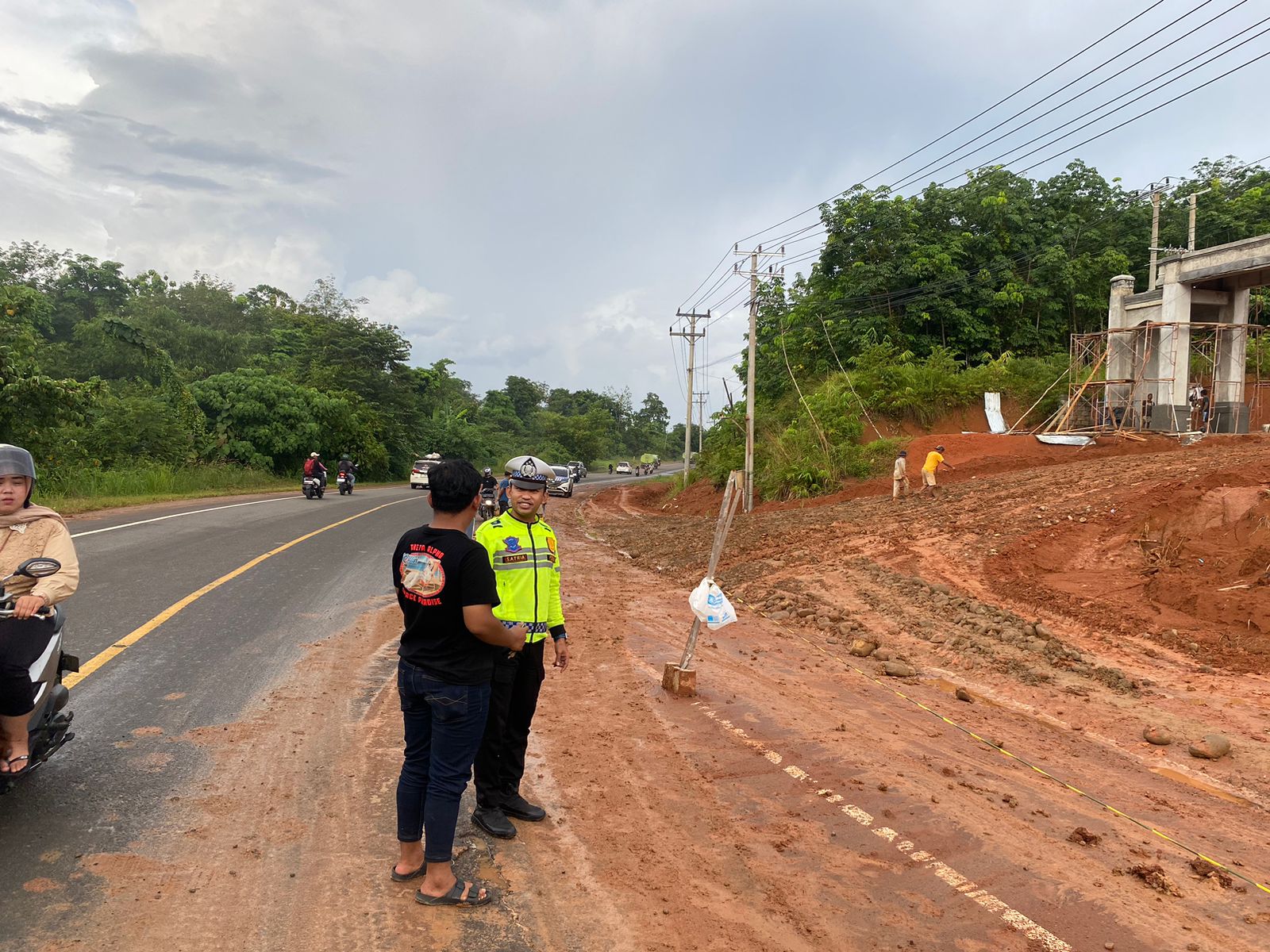 Satlantas Polres Musi Rawas (Mura), melihat kondisi Jalan Lintas Sumatera (Jalinsum), tepatnya didepan proses Pembangunan Pendopoan Rumah Dinas Bupati Mura, licin akibat jatuhnya tanah dan material yang jatuh kebadan jalan.